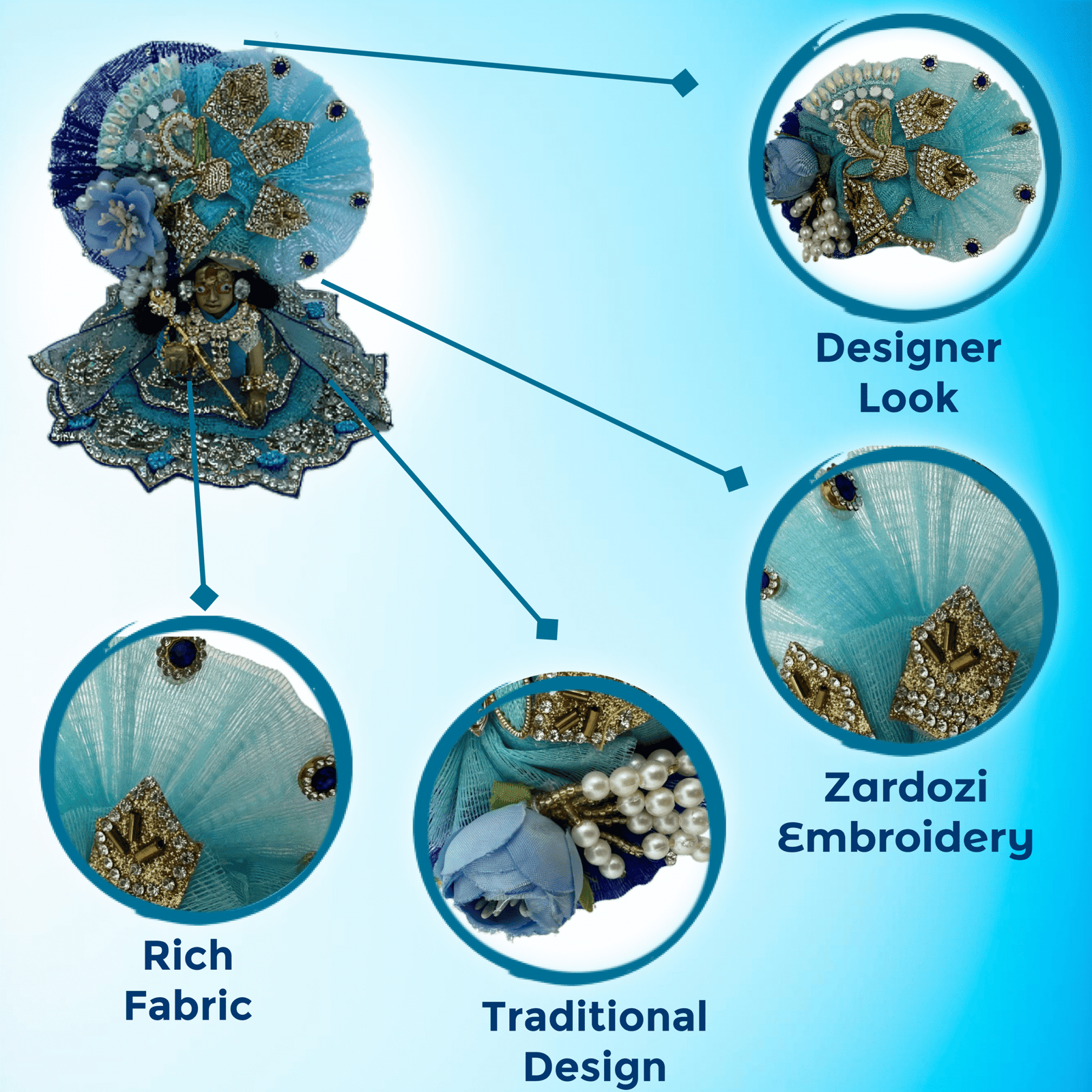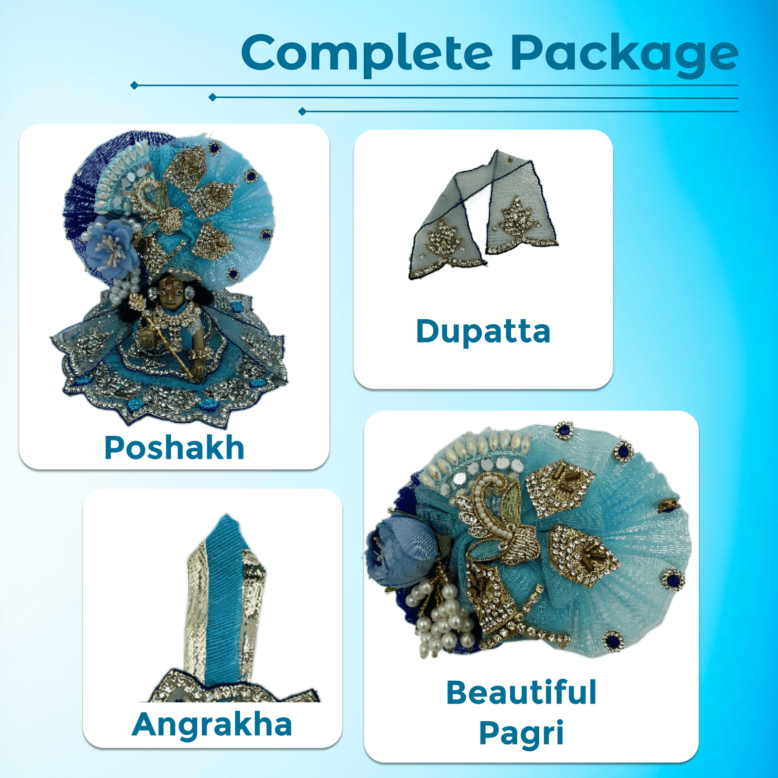 Kanha Blue Poshak | 4 No. Model | Size – 8 Inch Designer Poshak with Neckless, ANG Rakha and Beautiful Pagri | Heavy Zardozi Silk Net Dress for Krishna Ji | Thakur Ji