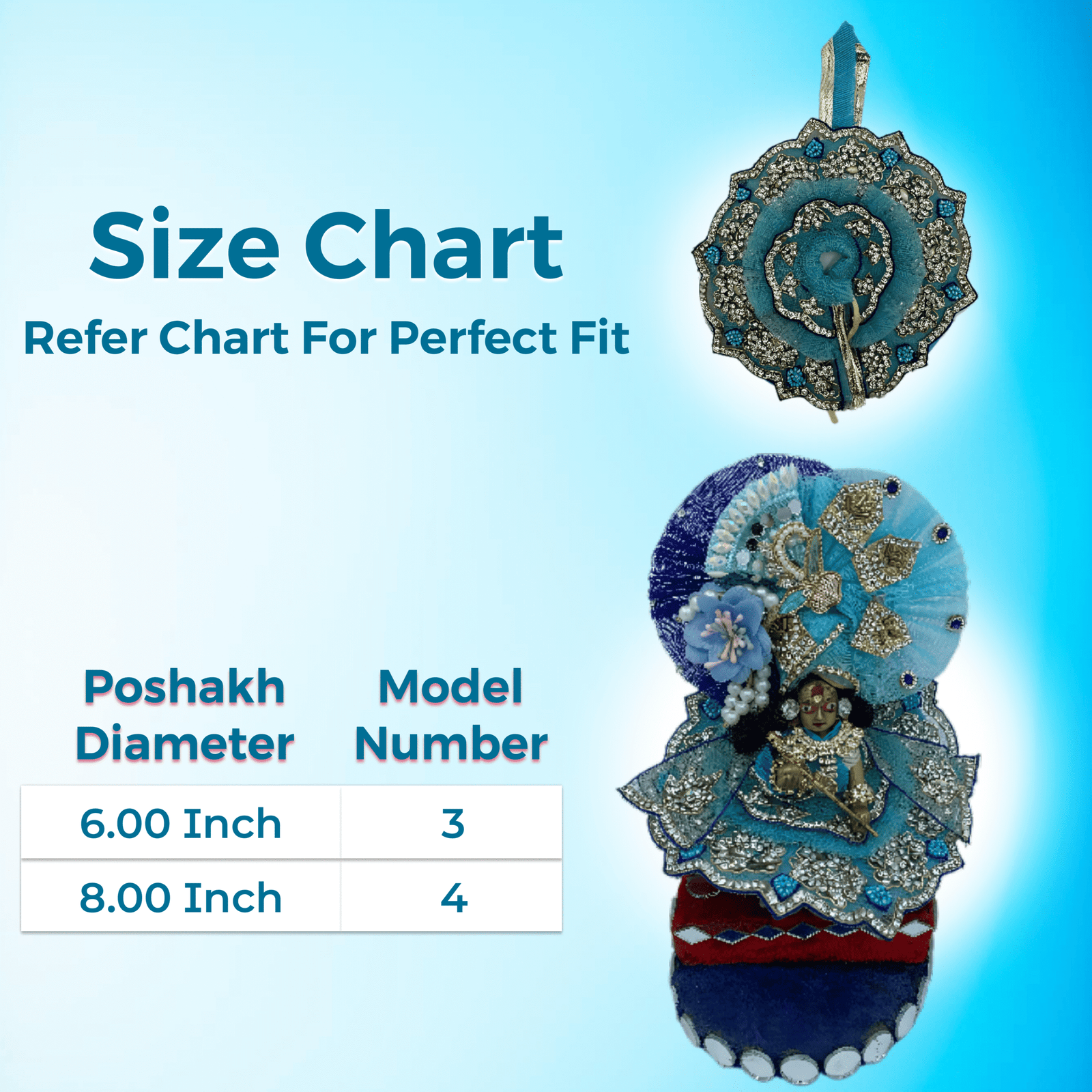 | Material | Luxurious Silk and Net Fabric: Crafted from fine quality silk and net fabrics, this poshak offers a luxurious feel and elegant drape. The combination of these fabrics ensures a delicate yet durable outfit, perfectly suited for dressing the deity on special occasions and daily rituals. |